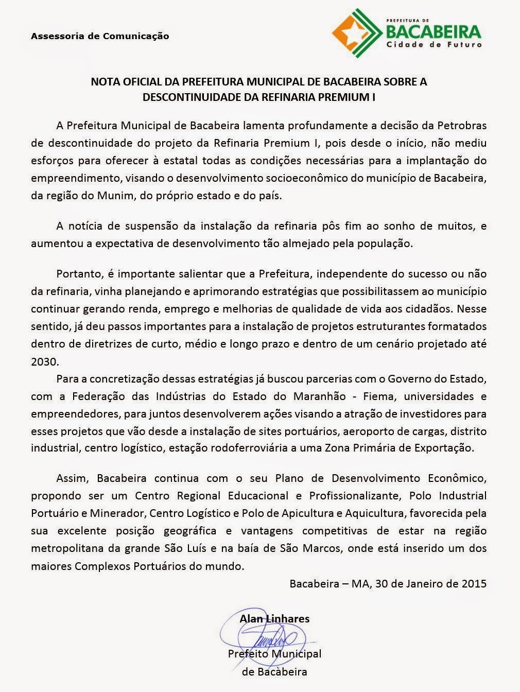 A prefeitura de Bacabeira esclarece, através de nota, sobre a desistência da construção da Refinaria Premium I, anunciada recentemente pela Petrobras.