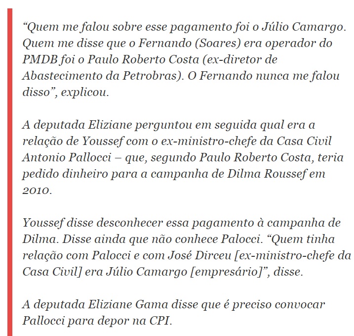 Youssef também mencionou no depoimento o nome do presidente da Câmara, Eduardo Cunha. Segundo Youssef, o empresário Júlio Camargo pediu a ele que pagasse a propina ao empresário Fernando Soares, que seria o operador do PMDB, para evitar que Cunha pedisse informações sobre o contrato da Petrobras com a empresa Toyo pelo aluguel de sondas pela Petrobras.
