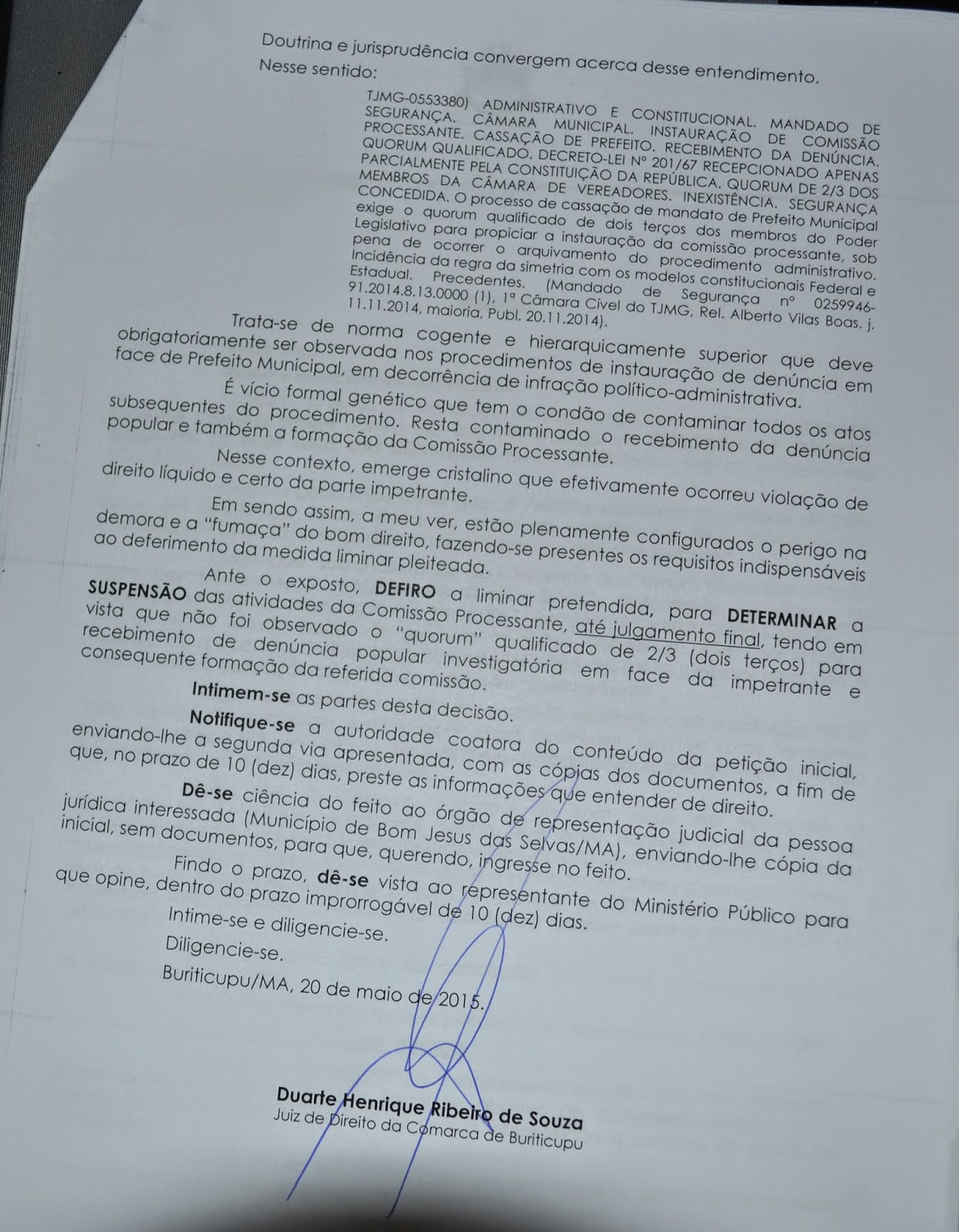 O juiz Duarte Henrique Ribeiro de Souza, titular da Comarca de Buriticupu, deferiu hoje (21) liminar em mandado de segurança impetrado pela prefeita de Bom Jesus das Selvas, Cristiane Damião (PTdoB), e mandou suspender os trabalhos de uma Comissão Parlamentar de Inquérito (CPI) instalada no município para apurar supostos desvios no Fundeb.