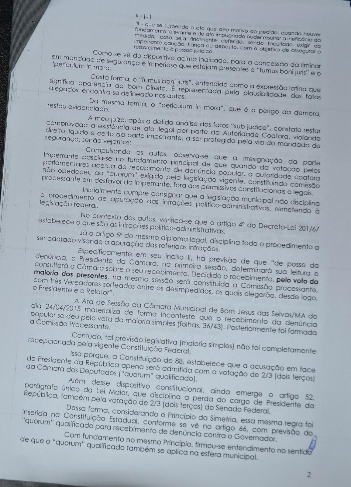 “Resta contaminado o recebimento da denúncia popular e também a formação da Comissão Processante. Nesse contexto, emerge cristalino que efetivamente ocorreu violação de direito líquido e certo da parte impetrante. […] Ante o exposto, DEFIRO a liminar pretendida, para DETERMINAR a SUSPENSÃO das atividades da Comissão Processante, até julgamento final, tendo em vista que não foi observado o “quorum” qualificado de 2/3 (dois terços) para recebimento de denúncia popular investigatória em face da impetrante e consequente formação da referida comissão”, decidiu.