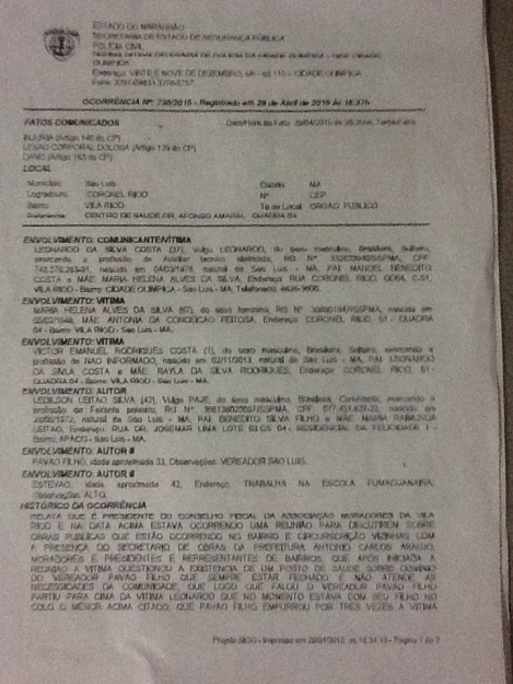 Leonardo Costa, um artesão de 37 anos, acusa o vereador Pavão Filho de empurrá-lo três vezes, tomar dele o tablet que segurava e também empurrar a mãe do integrante da associação de moradores, Maria Helena Alves da Silva, de 67 anos, que assistia à reunião. No dia seguinte, 29 de abril, o presidente do conselho fiscal da Vila Riod registrou um boletim de ocorrência no 18º DP, na Cidade Olímpica, acusando Pavão Filho de injúria, lesão corporal dolosa e dano. Também são acusados o presidente da Associação da Apaco, Ledilson Leitão Silva, e um homem identificado apenas como Estevão, funcionário da Fundação Maranhense de Assistência Comunitária (FUMAC) na Vila Janaína.