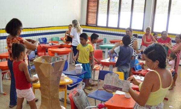 CURSOS E OFICINAS – A U.E.B. Darcy Ribeiro (Sacavém) também abre as portas aos finais de semana. As oficinas oferecidas atualmente são de reciclagem, futsal e caratê. Cada oficina tem em média vinte pessoas inscritas e as aulas são ministradas por pessoas da própria comunidade. Nas manhãs de sábado, a escola oferece ainda oficinas de letramento e matemática – abertas aos moradores, mas frequentadas principalmente por estudantes da própria escola, interessados em reforçar os conhecimentos. Já as demais atividades tem público majoritário de jovens e adultos. A dona de casa Kátia Cilene de Araújo Costa, 32, levou a filha Rivana Kaila Costa e Costa, 8, para participarem juntas da oficina de materiais recicláveis com papel. “É a primeira vez que participo de um projeto assim e estou achando maravilhoso. Produzimos aqui e eu consigo vender em casa. Minha filha também está gostando demais e aprendendo muito. Não vou mais perder um sábado, ainda quero fazer as oficinas de pintura em tecido”, contou, motivada.