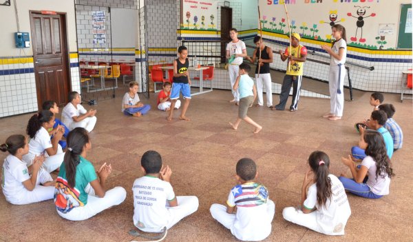 CAPOEIRA E DANÇA – A U.E.B. Amaral Raposo não é a única na zona rural a desenvolver atividades no final de semana. Na Vila Itamar, a U.E.B. Luís Rego oferece à comunidade as oficinas de artesanato e ponto-cruz, com foco no ensino de uma nova profissão e na geração de renda. A escola também sedia, aos sábados e domingos pela manhã, oficinas de capoeira e de dança de rua, com presença de crianças, adolescentes e jovens. No São Cristóvão, a U.E.B. Antônio Vieira é sede para oficinas de Pintura em Tecido, Crochê, Bordado em Fita e Futsal, com participação média de 15 pessoas por oficina. Geovana Marques Martins, de 14 anos, ex-aluna da rede municipal, encontrou no projeto “Relação Escola-Comunidade” uma maneira de matar as saudades da antiga escola. “Venho participar de todas as atividades porque assim diminuo a saudade dos amigos e professores da escola e ainda aprendo. Gosto principalmente do artesanato e da capoeira”, disse a estudante.