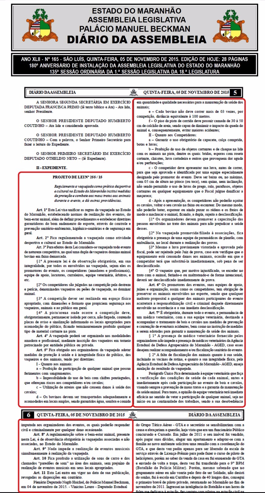 A lei foi publicada no dia 05 de novembro no Diário Oficial da Assembleia Legislativa e aprovada em plenário pelos deputados estadual através do requerimento 613/2015 em sessão plenária nesta terça (17). Agora o projeto de lei segue para aprovação na Comissão de Constituição e Justiça. O deputado Vinicius Louro é um amante dos esportes de montaria. A proposta do parlamentar é tornar a prática esportiva mais segura e com mais adeptos.