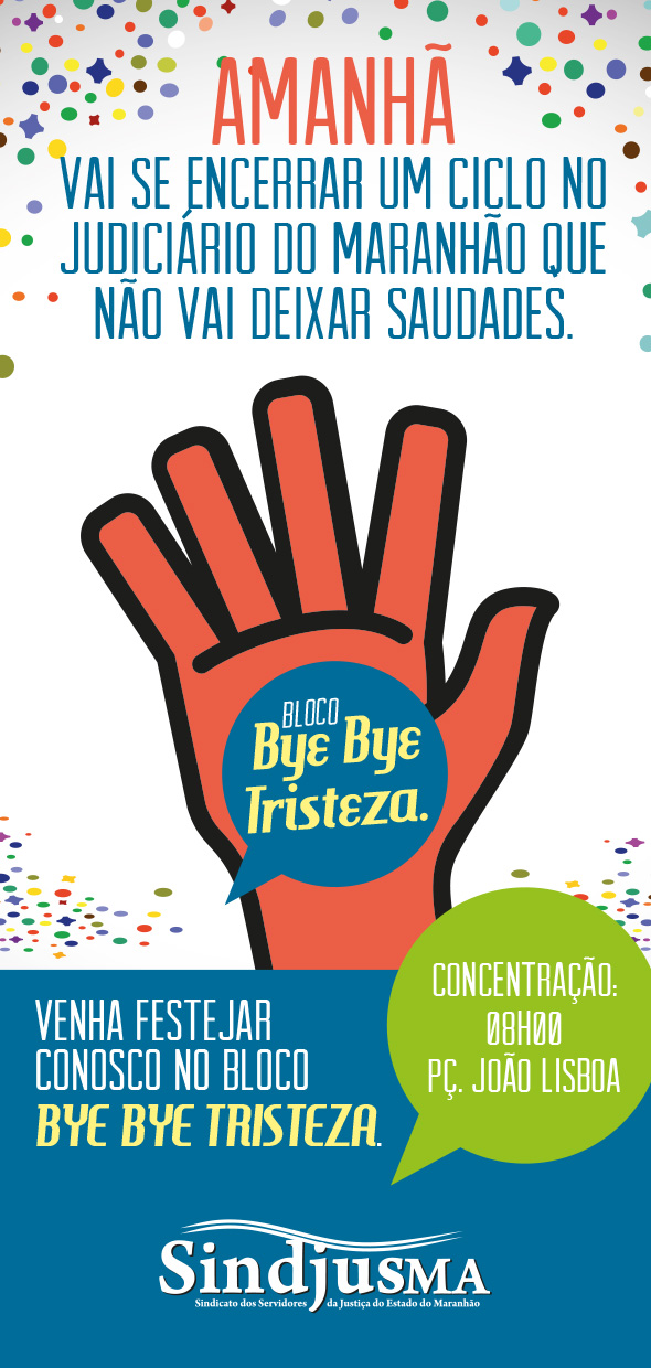 “BYE BYE TRISTEZA” será o tema da festa em comemoração ao fim da era da Desembargadora Cleonice Freire do Tribunal de Justiça do Maranhão. Organizado pelo Sindicato dos Servidores do Judiciário do Maranhão – SINDJUS/MA, o evento será quarta-feira, 16/12, na praça Pedro II, a partir das 9h30, em frente ao Tribunal de Justiça.