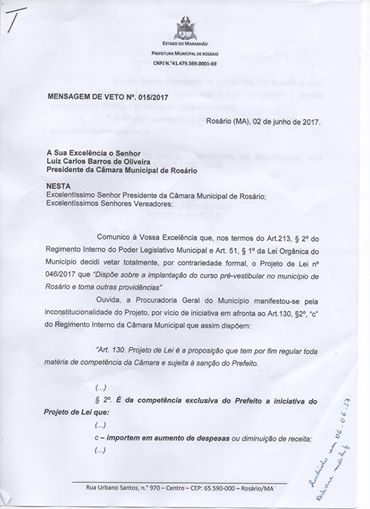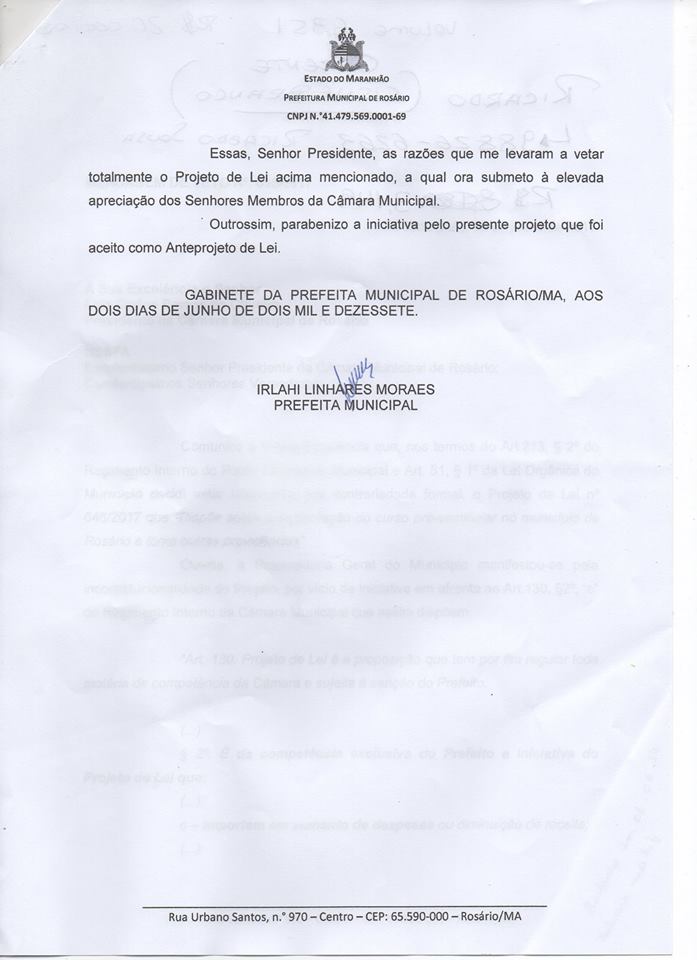 Para surpresa, a atual mandatário do município, Irlahi Linhares Moraes (PMDB) vetou o projeto de lei (veja abaixo), sob a alegação de que importaria em aumento de despesa e, portanto, seria de competência exclusiva da prefeita a iniciativa do referido projeto de lei.