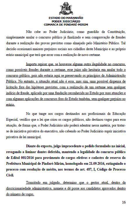 “É melhor para o Município na presente conjuntura é a manutenção do concurso, declarando sua legalidade, e determinando que o gestor atual comece a nomear e dar posse aos concursados para assumirem seus postos, pois vivemos em uma democracia onde prevalece o critério meritório para adentrar aos cargos públicos, e nada mais justo que seja através de um concurso, em que não há indícios de qualquer fraude, no qual foi respeitado a ordem de classificação, sem indicação de interferência da gestão passada, que os cargos públicos sejam ocupados”, afirmou a juíza da Comarca de Pindaré-Mirim.