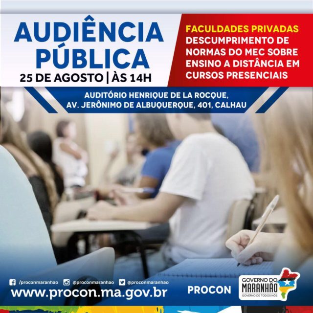 Nos últimos dias, o Instituto de Proteção e Defesa do Consumidor – PROCON MA recebeu centenas de reclamações de alunos e alunas das faculdades Estácio e Pitágoras. Por essa razão, e com o objetivo de garantir qualidade na prestação dos serviços educacionais, além de harmonia nas relações de consumo, fará uma audiência pública nesta sexta-feria (25/08), às 14h, no Palácio Henrique de La Rocque.