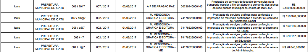 A farra de papel, o prefeito de Icatu (cidade a 405 quilômetros de São Luís), José Ribamar Moreira Gonçalves, realizou quatro contrato acima de meio milhão visando o fornecimento de material gráfico para o município em diversas secretarias.