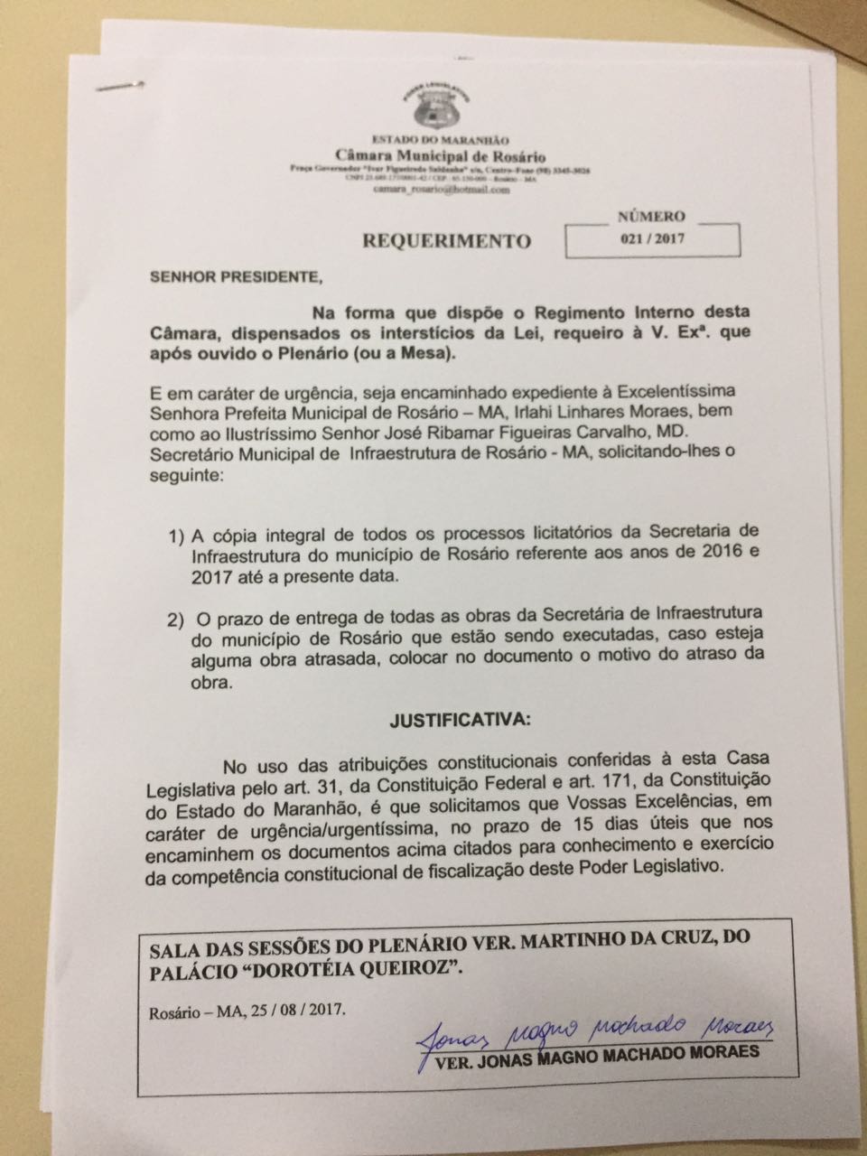 Na última sexta-feira (25), o vereador Jonas Magno (PDT) autor do requerimento nº 021/2017, de caráter de urgência solicitou informações sobre o processo licitatórios da secretaria municipal de infraestrutura do município, referente aos de 2016 e 2017.