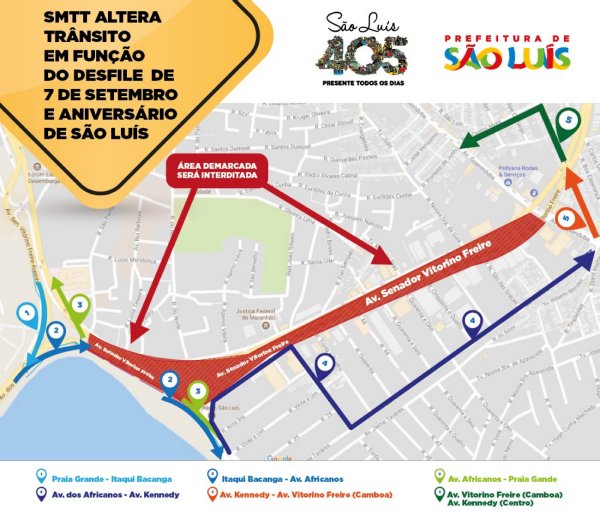 Em virtude dos desfiles em comemoração ao Dia da Independência e aniversário de São Luís, a Prefeitura, por meio da Secretaria Municipal de Trânsito e Transportes (SMTT), fará a interdição de trechos e modificará o itinerário das linhas de ônibus que circulam no Anel Viário e Praça Maria Aragão.