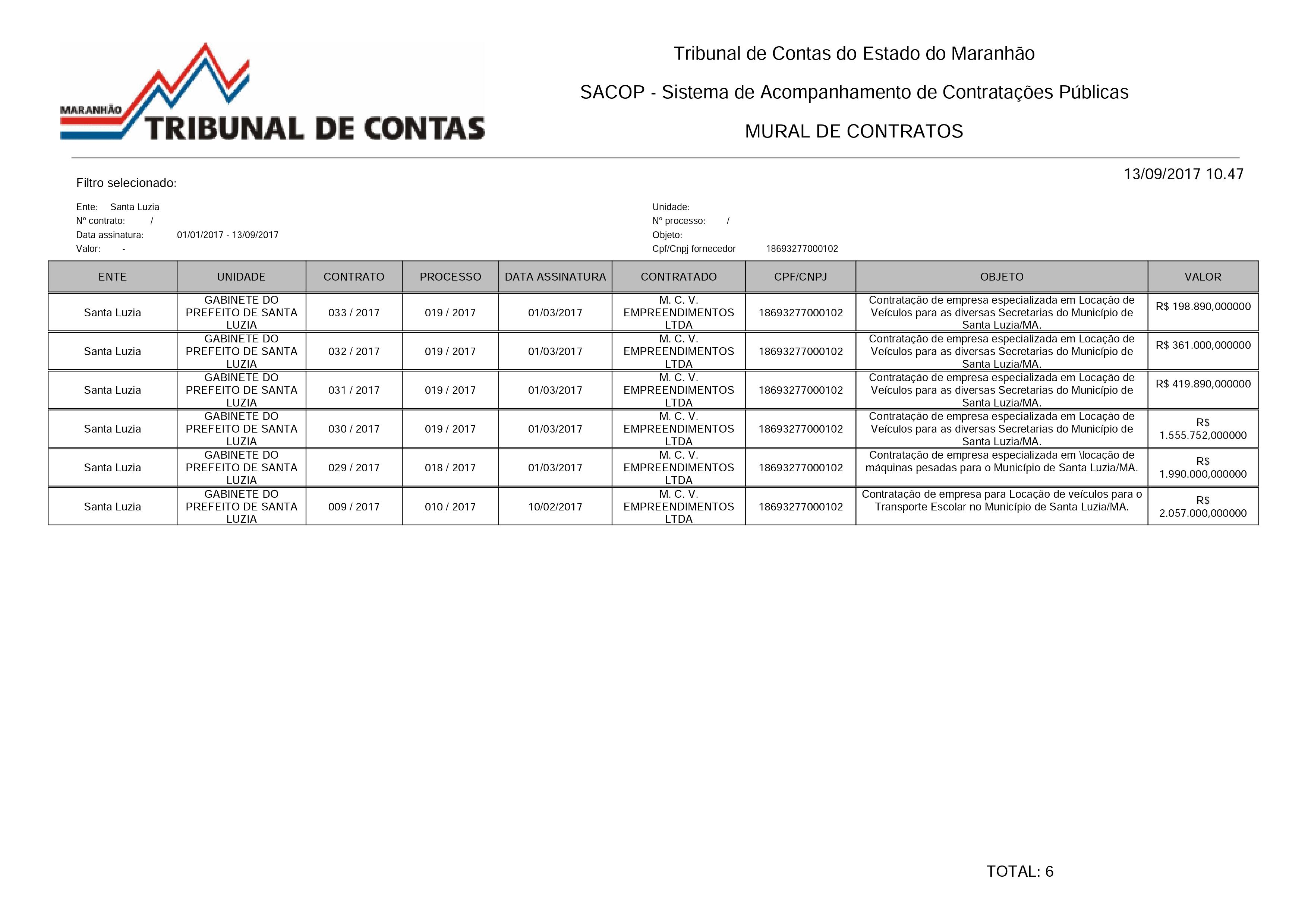 De acordo com o dados publicado no TCE – Tribunal de Contas do Estado do Maranhão, os seis contratos foram celebrados com a empresas M. C. V. Empreendimentos LTDA, localizada na zona rural de Pindaré-Mirim.