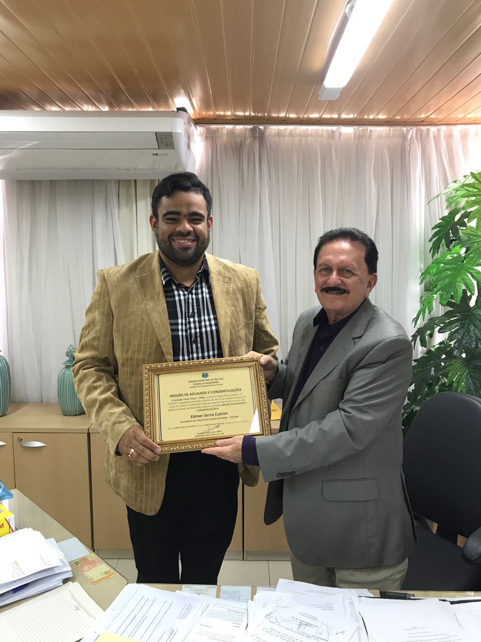 A Câmara Municipal de São Luís realizou uma homenagem ao conselheiro Edmar Cutrim, com a aprovação de uma Moção de Aplausos e Congratulações de Aplausos, durante sessão no dia 11 deste mês. A entrega da honraria foi realizada nesta quarta-feira, dia 20 de setembro, pelo vereador Paulo Vitor, durante visita ao homenageado.
