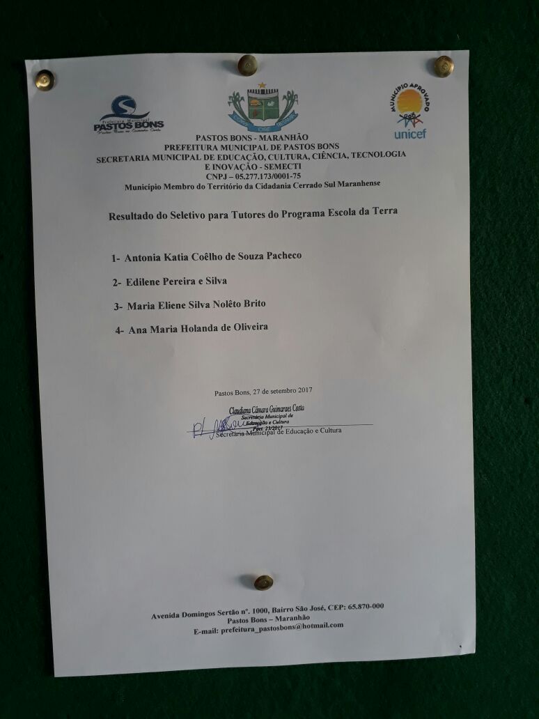 Na cidade de Pastos Bons (cidade a 530 quilômetros de São Luís), a prefeitura municipal, através da secretaria municipal de educação que fizeram um seletivo para contratar tutores (assessores pedagógico), para o programa escola da terra, o edital não foi divulgado com imparcialidade e legalidade para a população.