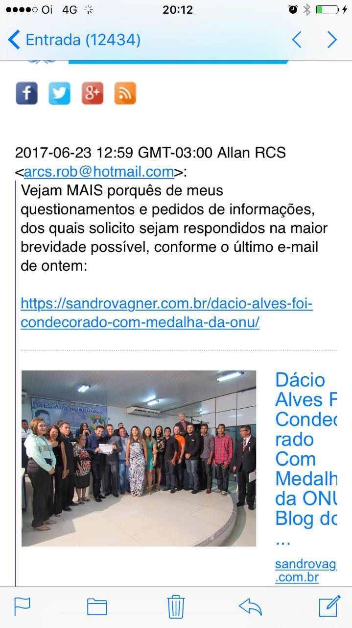 Em 08/06/2017 fiz o primeiro contato com a sede da ONU no Brasil, na cidade do Rio de Janeiro, solicitando informações se ele era membro dos quadros das Nações Unidas. Em 16/06 a ONU me responde que não o conhece e nem tem nenhum membro no Maranhão. Em 18/06 a ONU me ratifica a confirmação de que desconhece Dácio Viana, perguntei se ela tinha a Medalha Tiradentes como uma de suas condecorações, se a havia outorgado ao senhor Dácio em sessão solene da Câmara Municipal de Pedreiras de 27/Abril/2016, se tal outorga o fazia membro das Nações Unidas e se o senhor Albertino Rodrigues Pereira, que esteve na referida sessão da Câmara Municipal era Agente Especial dos quadros da ONU e esteve aqui naquela solenidade representando a entidade e a resposta foi negativa, como podemos comprovar abaixo, o mesmo é um pastor evangélico basta escrever o nome do mesmo no Google, ALBERTINO RODRIGUES PEREIRA. Esse senhor DÁCIO tentou comprar a vaga de vice-prefeito na chapa de França em PEDREIRAS e foi rechaçado. É megalomaníaco, carreirista e tenta se viabilizar para deputado federal e tomar de conta do Conselho Regional de Enfermagem do Maranhão-COREN como trampolim financeiro e político e para tanto já andou assediando até o Presidente do COFEN, o Conselho Federal.