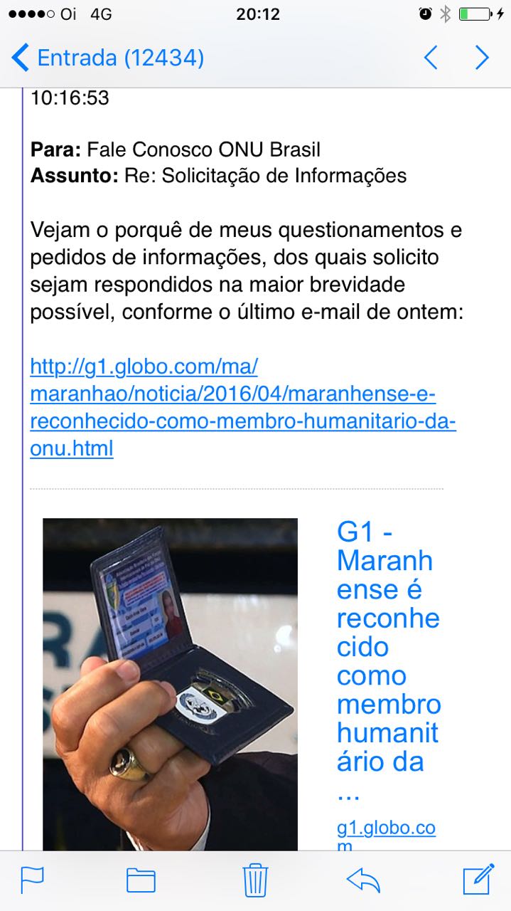 E esse rapaz um dia desses postou num grupo de WhattsApp que foi condecorado como membro da ONU e mostrou uma credencial sua e um adesivo da ONU que ele usa em seu carro. E completou com a frase que me deixou boquiaberto e me fez ir atrás da verdade; disse ele: “nem a polícia federal me para COM MINHA CARTEIRA DA ONU e quando para ainda pede desculpas”. Nunca vi tamanha prepotência e delírio. Ledo engano dele!