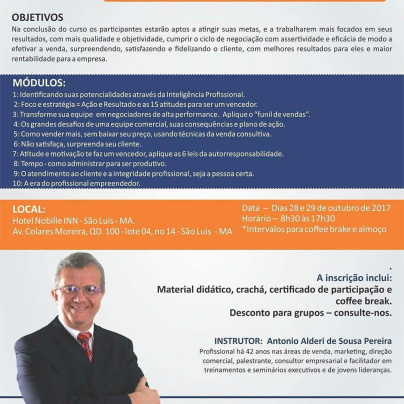 Você quer melhores resultados e maior rentabilidade para a sua empresa? Então, não deixe de participar do curso sobre “Inteligência Profissional” que vai acontecer em São Luís nos dias 28 e 29 deste mês, das 8: h às 17:30, no Hotel Nobille INN, no Renascença/ São Francisco. O evento será ministrado pelo palestrante e coach, Antonio Alderi de Sousa Pereira, renomado profissional nas áreas de vendas, marketing, consultor empresarial e facilitador em treinamentos e seminários executivos e de jovens lideranças.
