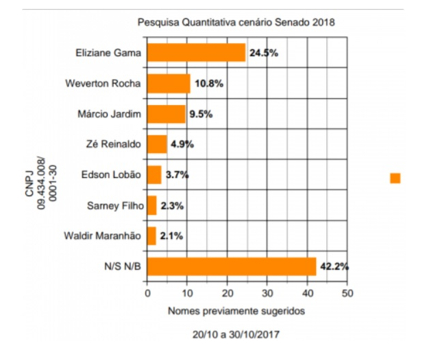 A deputada federal Eliziane Gama (PPS) aparece liderando com folga na corrida por uma das duas vagas ao Senado Federal. Eliziane possui 24,5% das intenções de voto contra 10,8% do deputado federal Weverton Rocha (PDT); na terceira posição está o ex-secretário de Esporte e Lazer do Maranhão, Márcio Jardim (PT), com 9,5%.