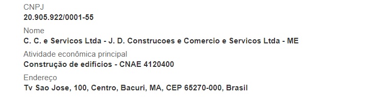 A empresa J.D. Construções, Comércio e Serviços LTDA-ME (CNPJ: 20.905.922/0001-55), localizado na Travessa São José, 100, no Centro do município de Bacuri, faturou R$ 68.210,00 (Sessenta e oito mil duzentos e dez reais).