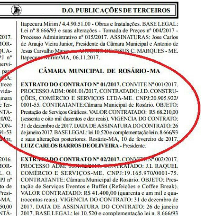 Segundo publicação do Diário Oficial do dia 01 de janeiro de 2017, o extrato de contrato, nº 001/2017, tem por objetivo prestação de serviços gráficos especializados para a câmara municipal e teve inicio dia 10 de fevereiro de 2017, vigência até 31 de dezembro deste mesmo ano.