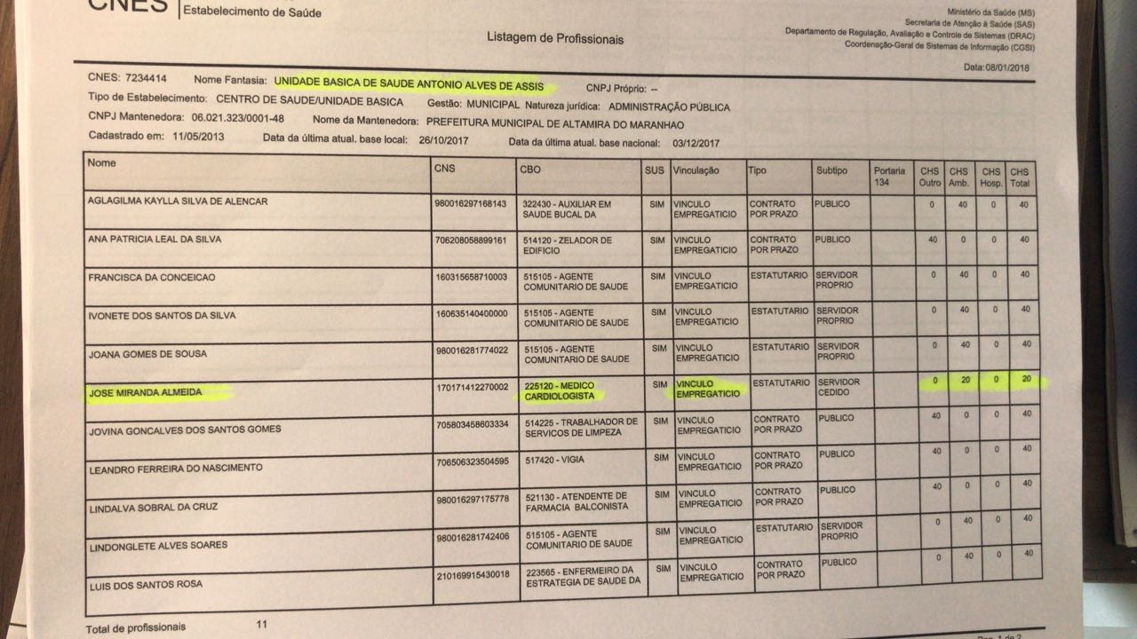 Recursos da pasta, que deveriam ser aplicados na melhoria da qualidade de vida do povo, servem para pagar altos salários a todos eles, enquanto que a maioria da população padece com a falta do básico em materiais hospitalares. O médico José Miranda Almeida, pai do prefeito, é nomeado sob uma carga de trabalho de 40h semanais na Unidade Básica de Saúde de Altamira e na Unidade de Saúde Antonio Alves de Assis, pertencente ao povoado Caldeirão, zona rural do município.