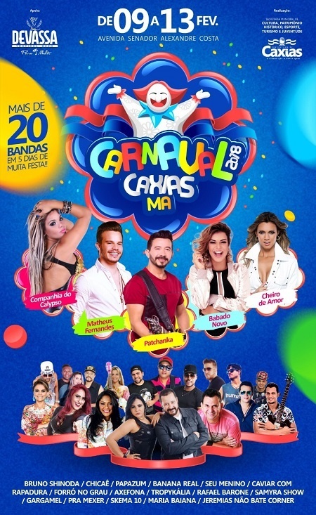 A Prefeitura de Caxias, por meio da Secretaria Municipal de Cultura, Patrimônio Histórico, Esporte, Turismo e Juventude vai promover um dos melhores carnavais do Nordeste. O “Carnaval que a gente quer” apresenta uma série de atrações locais, regionais e de renome nacional em 2018.