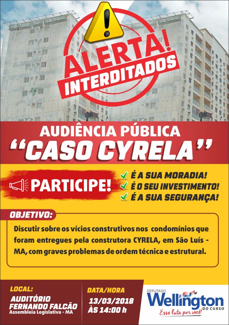 O deputado estadual progressista Wellington do Curso utilizou as redes sociais, nesta segunda-feira (12), para convidar os maranhenses para participarem de importante audiência pública que discutirá o “Caso Cyrela”.