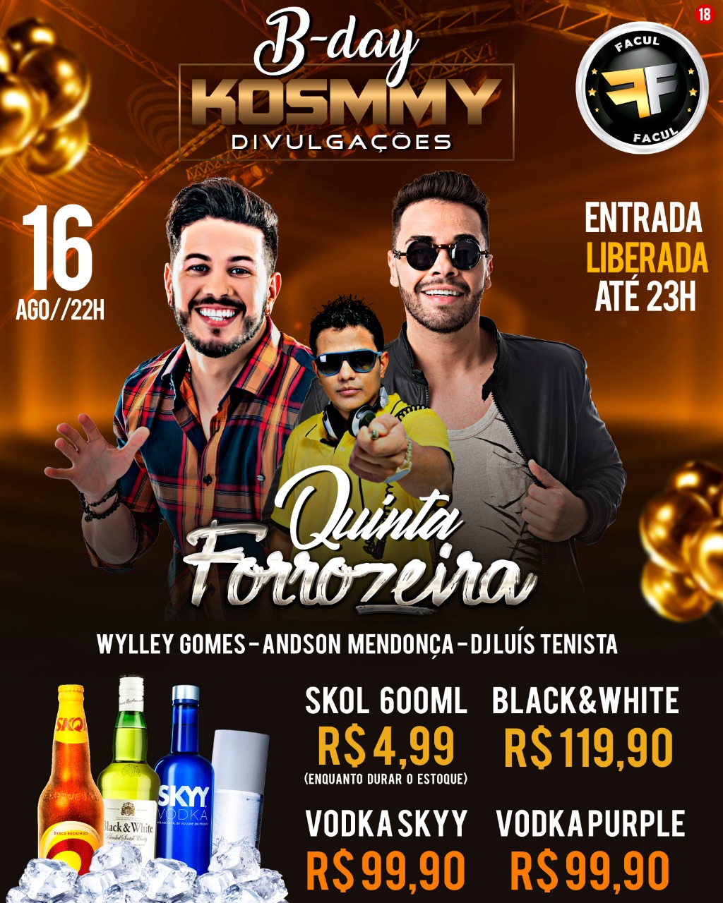A casa de shows Faculdade do Forró, localizado na Av. São Luís Rei da França, 88 – Turu, em São Luís do Maranhão, receberá nesta quinta-feira (16), a festa em comemoração ao aniversário do promotor de eventos, kosmmy kasttro. E para comemorar a data, amanhã, será transformada na mais forrozeira da capital maranhense com os shows dos cantores: Andson Mendonça, Wylley Gomes e DJ Luís Tenista.