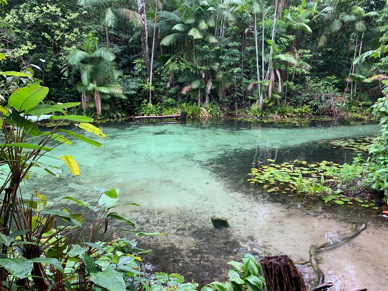 Uma lagoa com sua água verde cristalina e quase coberta pela vegetação na beira da estrada.