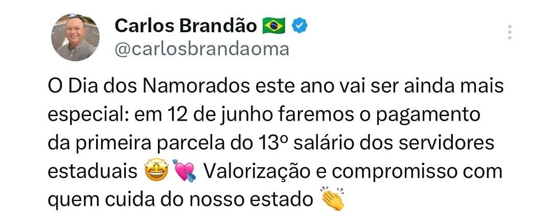 “Este ano, o Dia dos Namorados vai ser ainda mais especial: em 12 de junho faremos o pagamento da primeira parcela do 13º salário dos servidores estaduais”, escreveu o governador, em tom descontraído.