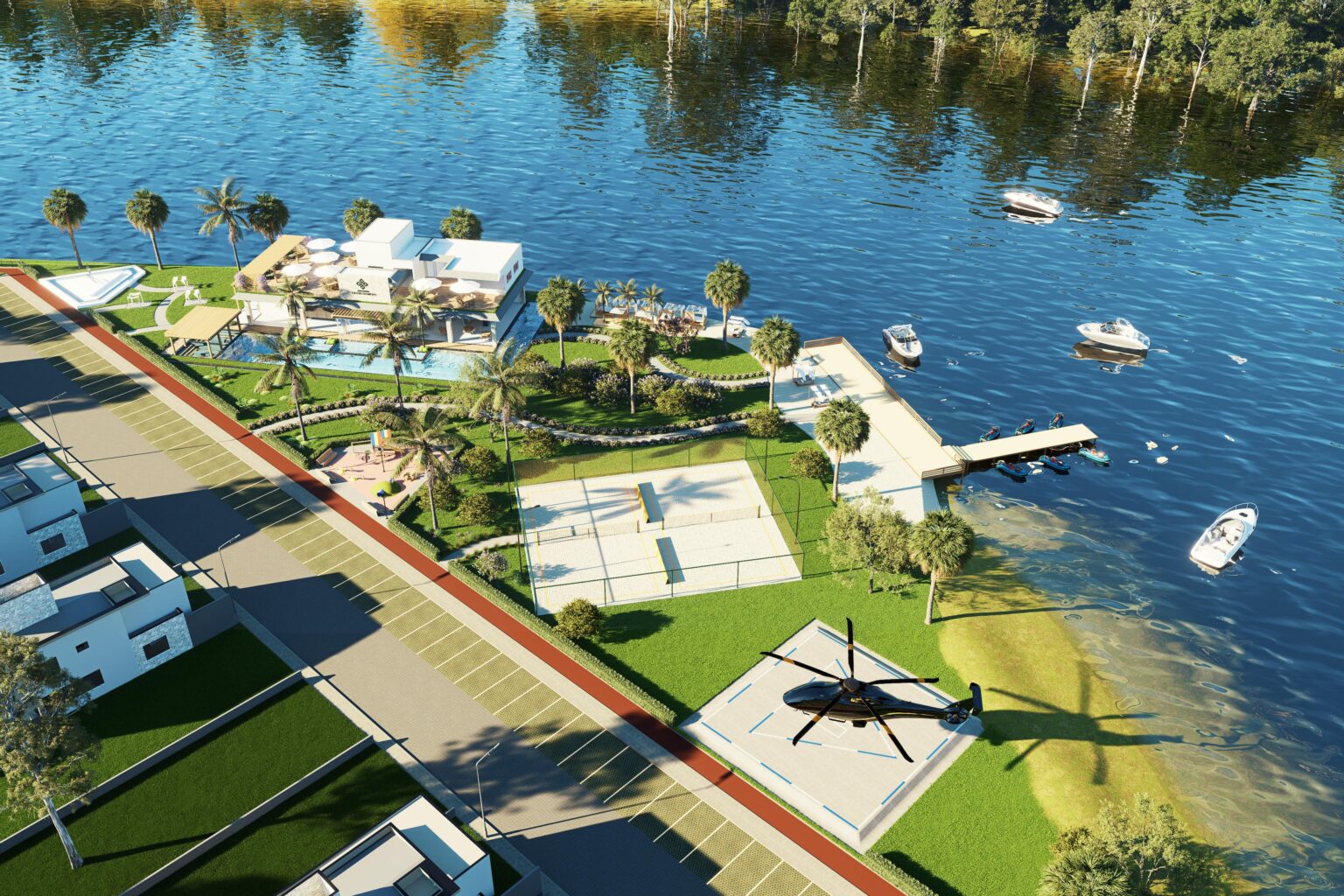 Com mais de 12 mil m² de área de lazer, o Grand Diamond oferecerá uma estrutura completa: deck beira-rio, piscinas, rooftop, espaço gourmet, centro comercial, empório, academia climatizada, ciclovia, campo de futebol, quadras de beach tennis, salões de festas e jogos, playground, bangalôs, espaço pet e até heliponto.